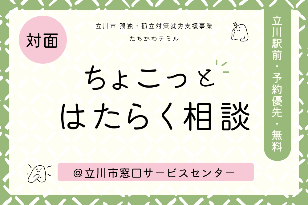 - (概ね)15〜50代半ばくらいの方 ⽴川市に住んでいる、あるいは学校・職場が市内にある⽅。 または、ハローワーク⽴川・たちかわサポステ等の⽀援機関を利⽤したいと考えている⽅が対象です。